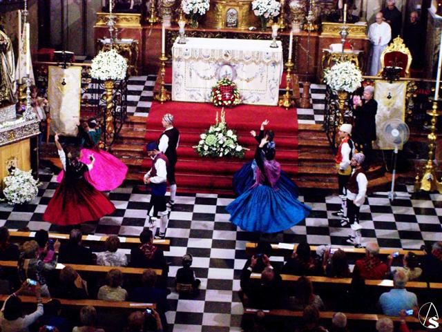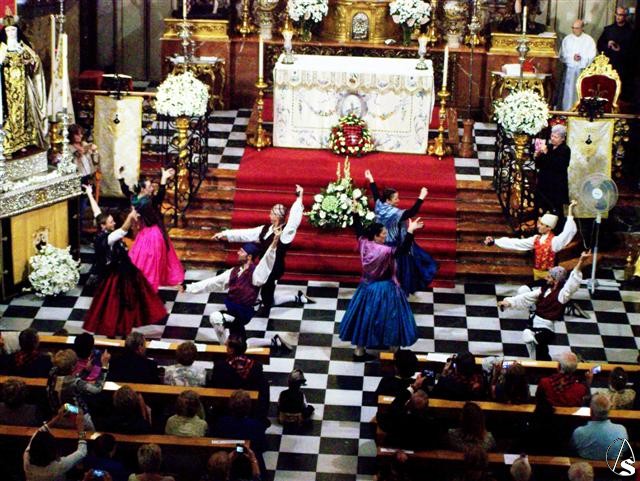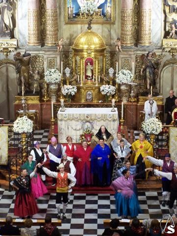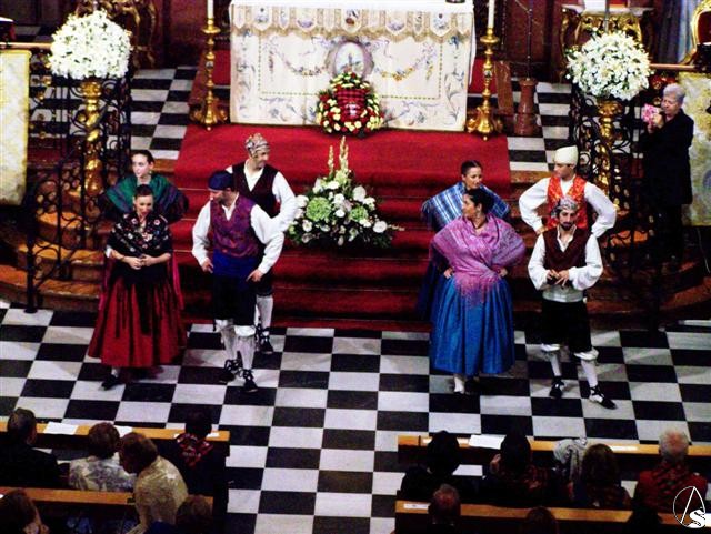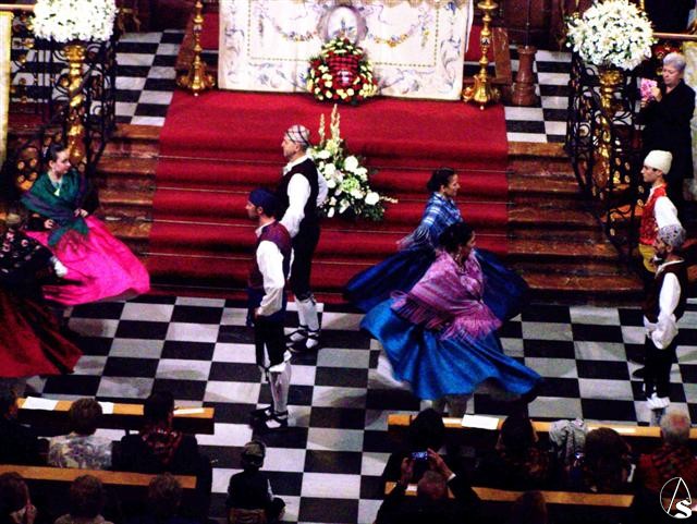 Poco antes de las 11 horas comenzó la solemne misa del Pilar, con ofrenda floral y baile de la Jota en el ofertorio y al final de la eucaristía, ante una iglesia expectante por este baile regional que este año estuvo a cargo del Coro baturro de la localidad aragonesa de Villanueva de Gállego. Se concluyó con el Himno oficial a la Virgen del Pilar.