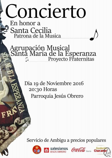 Arte Sacro. La Agrupación musica Sta. Mª. de la Esperanza (Proyecto Fraternitas) ofrecera un concierto en honor a Santa Cecilia el sabado 19 de noviembre a partir de las 20,30 horas en la parroquia de Jesús Obrero (Polígono Sur) en el cual se estrenaran varias composiciones. Tambien habrá servicio de ambigu a precios populares.
