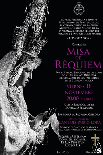 La Real. Fervorosa e Ilustre Hermandad de Penitencia del Santísimo Cristo de la Buena Muerte, Nuestra Señora de la Esperanza, Nuestra Señora del Rosario y Beato Ceferino, Mártir (“Los Gitanos”) consagra, tal como prescriben sus Reglas, la Santa Misa de Réquiem por el eterno descanso de las almas de sus hermanos difuntos, con especial intención al de los fallecidos en este año en curso.