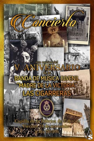Arte Sacro. Hoy viernes 18 de noviembre a las 20,30 horas tendrá lugar en la capilla de la Hermandad de las Cigarreras un concierto de la Banda juvenil de música Madre de la Victoria, con motivo de su V aniversario fundacional.