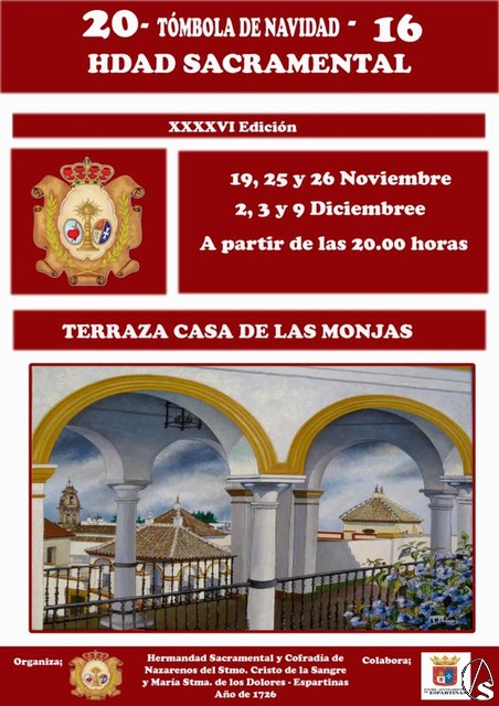 Fran Granado. Como cada fecha navideña esta antigua Hermandad Sacramental de Espartinas celebra su tradicional tómbola de Navidad, en su edición número 46 que comenzó el día 19 de Noviembre tras la Santa Misa de Requiem, en sufragio a los Hermanos difuntos, Viernes y Sábados por la tarde, sobre las 20:00 y Domingos en horario matinal. Estará abierta hasta el próximo 9 de Diciembre de 2016.