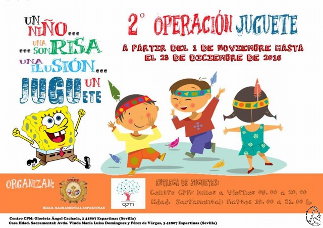 También, la II Operación juguete en colaboración con el centro CPM Espartinas, desde el 1 de Noviembre de 2016 hasta el próximo 23 de diciembre, pueden llevar sus regalos a la Casa Hermandad los martes en horario de 19:00 a 21:00 y en el Centro CPM Espartinas de lunes a viernes de 09:00 a 20:00 de la tarde.