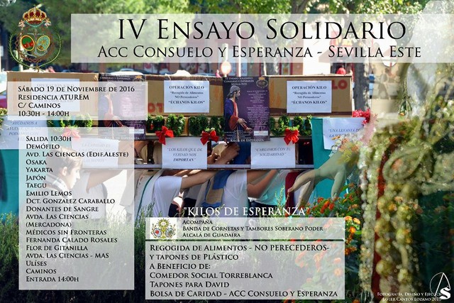 Arte Sacro. La Asociación Cultural Cofrade "Consuelo y Esperanza" (Sevilla Este), realizará el próximo sabado 19 Noviembre, el IV Ensayo Solidario de Costaleros, para la recogida de Alimentos no perecederos y tapones de plastico.