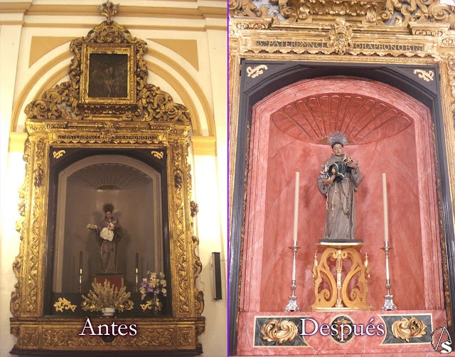 Fran Granado. Dentro de las obras de mejoras y conservación del patrimonio de la Iglesia Conventual del Corpus Christi de El Viso del Alcor efectuadas durante el presente año, la imagen de San Antonio de Padua ha quedado expuesta en una nueva peana, una obra realizada en madera por Sebastián Martín Algaba y Antonio José Gavira Toledano.