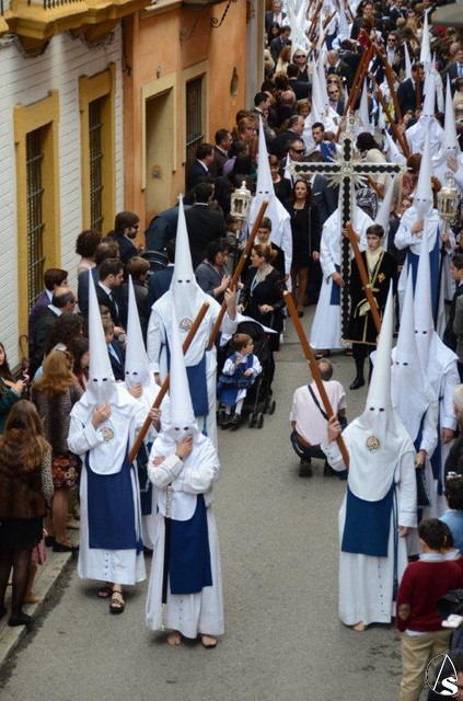 Y como no “El Nazareno de Albores “reconocimiento a una trayectoria de bien hacer por el mundo de nuestras hermandades y cofradías, esa estatuilla plateada que desde el anonimato del nazareno y la luz del farol que porta como símbolo de esta entrega personal que hoy se otorga a este “hombre bueno de alma grande”, amigo Pepe aunque esta estatuilla pudiera representar a cualquier anónimo nazareno de cualquier cofradía, se me antoja que para ti y en esta ocasión, este nazareno, caminará al atardecer por las inmediaciones de la Casa de Pilatos, a esa hora mágica y celeste donde la luz se transforma en tiniebla, vestirá túnica blanca y celeste de tu hermandad que un día dio amparo y cobijo a “Los Negros” de esta ciudad y que tu Cristo de La Fundación desde su muerte sublime, iluminado por la luz mortecina que emana de sus faroles, se transformará un año más en la luz dorada y brillante de la candeleria de una Virgen acompañada de ángeles blanco y negros como preconizara Antonio Machín, y que simboliza la máxima expresión de esas vidas que día tras día, nos sigues regalando.