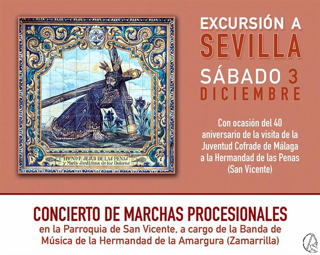 Arte Sacro. El próximo sábado 3 de diciembre visitará a la hermandad de las Penas de San Vicente un grupo de cofrades de la juventud cofrade malagueña y la Archicofradía Sacramental de Pasión de Málaga, que en celebración de su XL aniversario se desplazan a Sevilla, donde a las 12 horas, en la capilla y ante los sagrados titulares rezarán el Angelus, con la participación de la Capilla Musical de la Hermandad de la Amargura (Zamarilla), de Málaga.