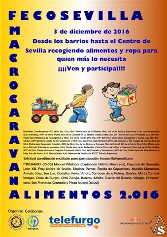 Como en años anteriores, la Federación de Asociaciones Cofrades de Sevilla, celebrará su IV Macrocaravana de recogida de alimentos, que tendrá como punto de partida el Distrito Macarena (c/ Manuel Villalobos) a las 10 y llegada el Ayuntamiento de Sevilla (Pz. de San Francisco) en torno a las 14 horas.