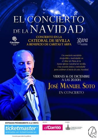Arte Sacro. El viernes 16 de diciembre, a las 20,30 horas, tendrá lugar la Catedral de Sevilla, un concierto de villancicos y canciones navideñas a cargo del artista José Manuel Soto, a beneficio de Cáritas y Arpa, organizado por El Correo de Andalucía. Las entradas estarán disponibles en breves fechas en Ticketmasters.