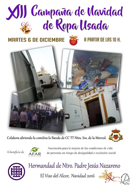 Fran Granado. Hoy día 6 de diciembre la Hermandad de Jesús Nazareno de El Viso del Alcor realizará su XIII campaña solidaria de recogida de ropa usada y mantas de abrigo. Esta recogida de ropa será, al igual que los años anteriores, a beneficio de la Asociación AFAR de Alcalá de Guadaíra.