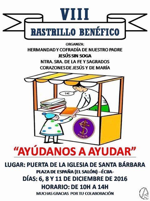 Un año más la Hermandad de Ntro. Padre Jesús sin soga de Écija se dispone a celebrar su tradicional Rastrillo Benéfico. Este 2016 celebrarán la octava edición, del que es uno de los eventos principales dentro de la hermandad por sus características y finalidad última.