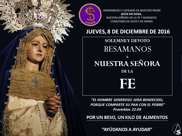 El próximo jueves 8 de diciembre, Festividad de la Inmaculada Concepción, estará expuesta a la veneración de los hermanos y fieles Nuestra Señora de la Fe en solemne y devoto besamanos.