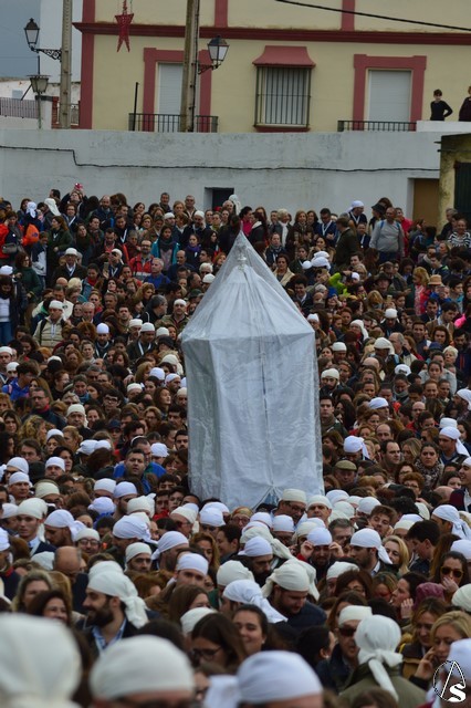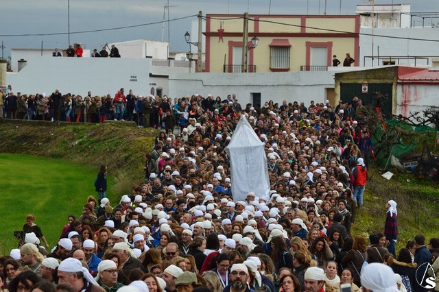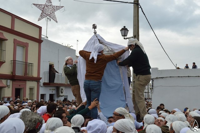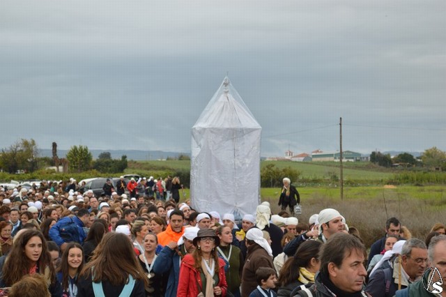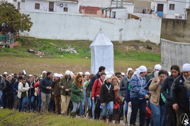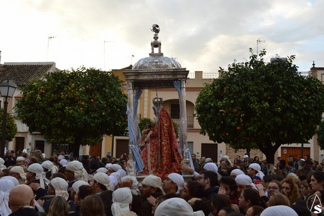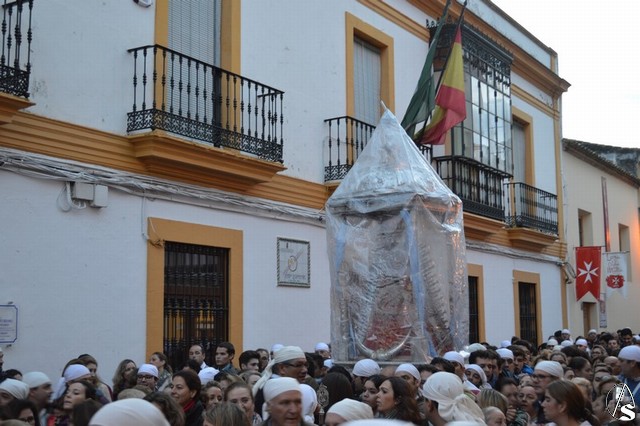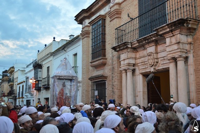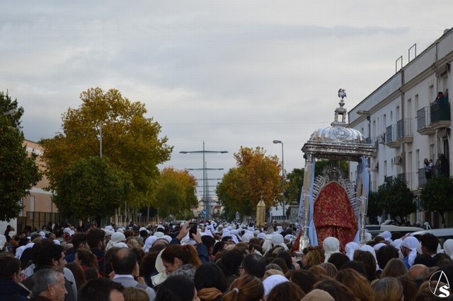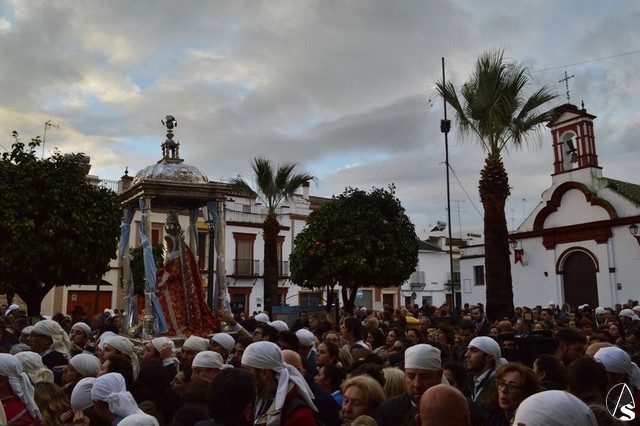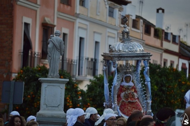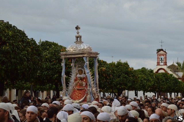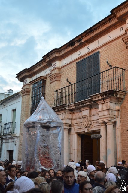 Sobre las diez de la mañana dejaba atrás las últimas casas del pueblo e iniciaba un largo camino de unos 11 kilómetros que la devolvería a su casa. La lluvia hizo acto de presencia durante el camino pero eso no impidió a Lora del Río dejar de acompañar a su bendita Patrona. Atravesó caminos duros dejando bellas estampas al cruzar la pedanía de Setefilla buscando las Escaleretas antiguas del camino de la Virgen antes de llegar a la Cruz del Humilladero donde fue despojada de ese velo que cubre sus andas antes de entrar en su Santuario cuando aún la luz no se había marchado.