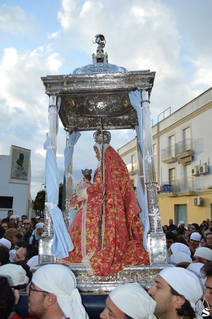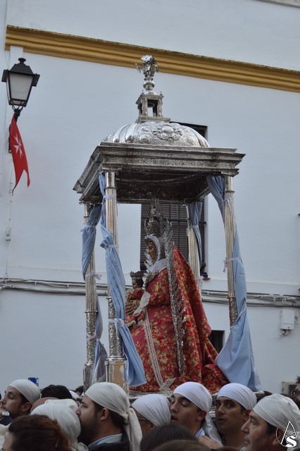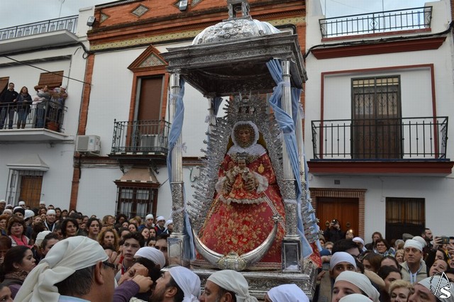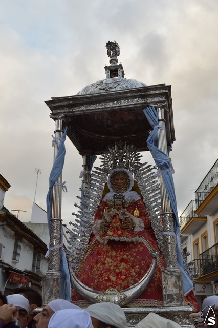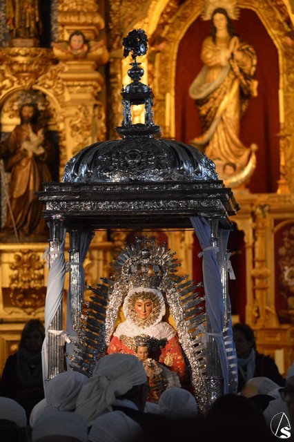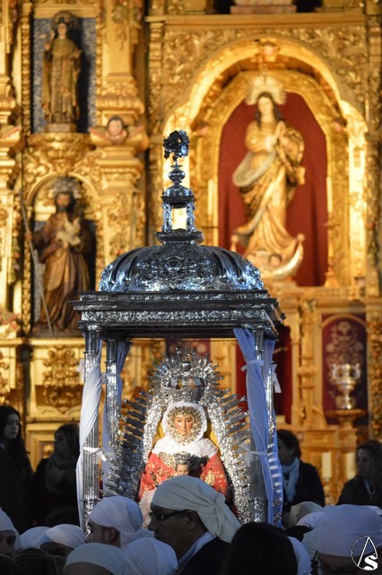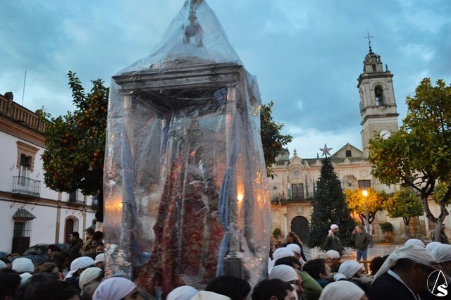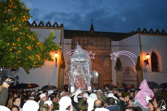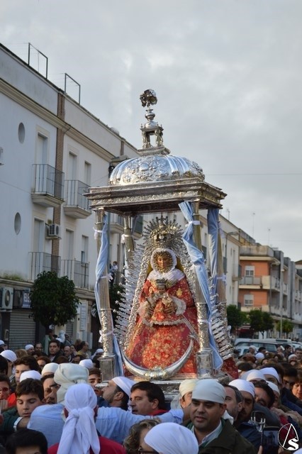 Minutos después de las ocho de la mañana atravesaba el dintel del Templo Parroquial cuando aún el día no había despuntado. Dos estrellas de luces la despidieron en la Plaza que lleva su nombre, un lugar lleno de fieles que no querían dejar sola a la Madre de Setefilla aunque la lluvia estuviese presente. Poco a poco, aunque sin parar, la Virgen de Setefilla continuaba por la calle San Juan cuando las campanas de la esbelta torre de la Asunción repicaban de gozo despidiéndola.