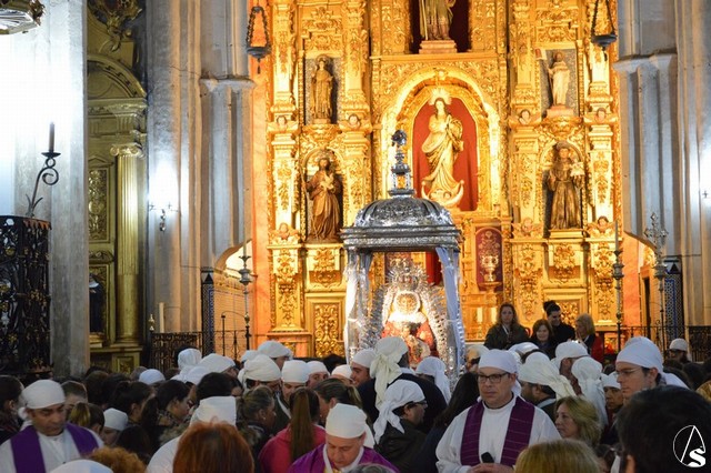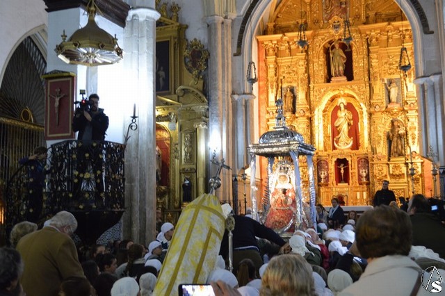 Nuestra Señora de Setefilla Coronada aguardaba en la nave central del Templo de la Asunción, tras bajar del presbiterio en la tarde del sábado, la llegada de las primeras luces del día para iniciar el regreso a su Santuario. Esperaba en su templete de plata junto a numerosos loreños y setefillanos que la han acompañado durante toda la noche despidiéndose entre rezos de ella. A las siete de la mañana se iniciaba la Sagrada Eucaristía con un Templo lleno de fieles. Tras la misa no cesaron los vivas y las salve a la Madre de los loreños esperando la decisión última de la Hermandad Mayor sobre el traslado de la venerada imagen ya que las previsiones meteorológicas no eran muy halagüeñas.