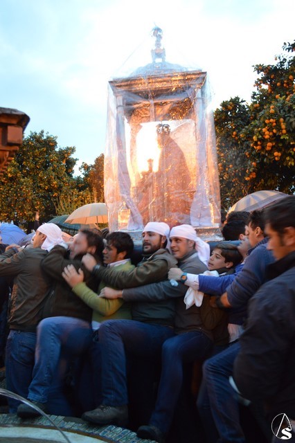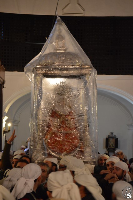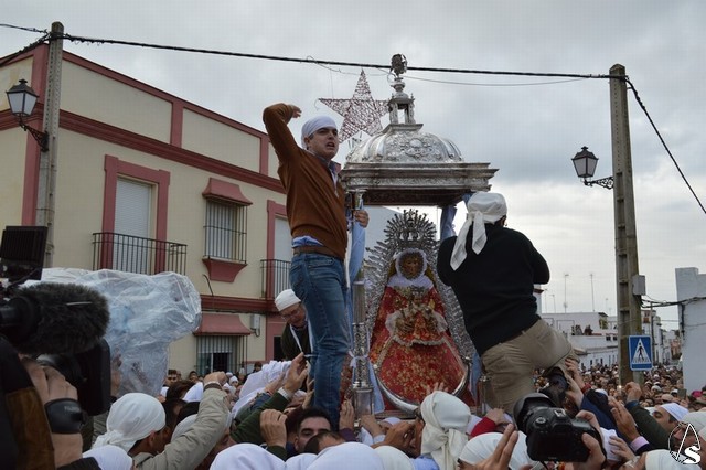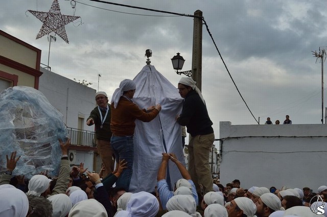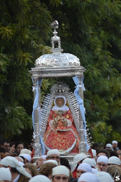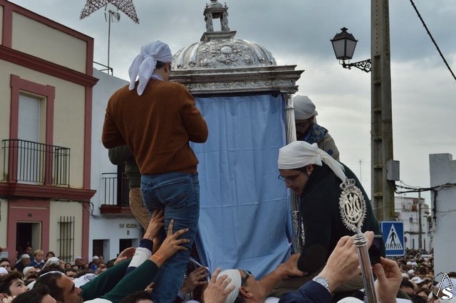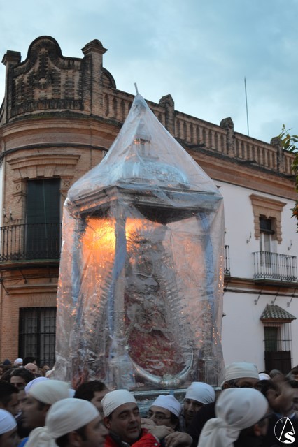 Eran las ocho en punto de la mañana cuando la Virgen de Setefilla se alzaba en la Parroquia y las lágrimas de numerosos loreños recorrían sus mejillas ante una estampa que se repite cada siete años. En el interior del Templo se le colocó a las andas un plástico para proteger a la imagen, y es que en esos momentos una leve llovizna caía sobre Lora del Río, algunos piensan que eran las lágrimas de aquellos que hace años se marcharon junto a María Santísima y ahora la contemplan desde el cielo.