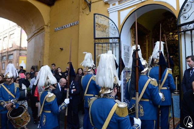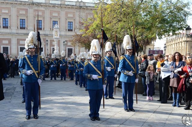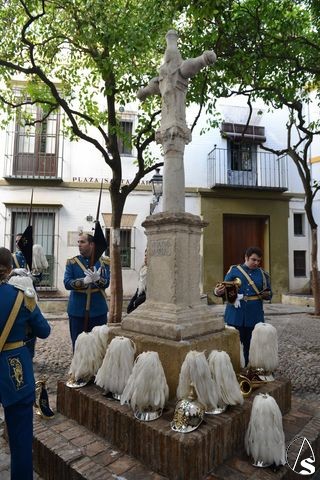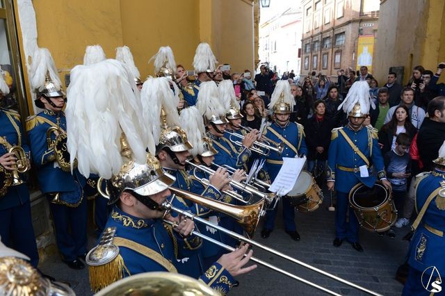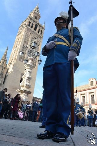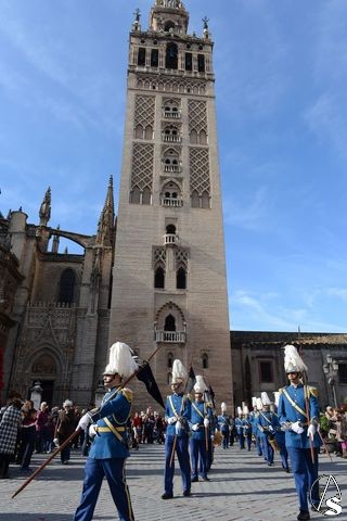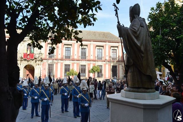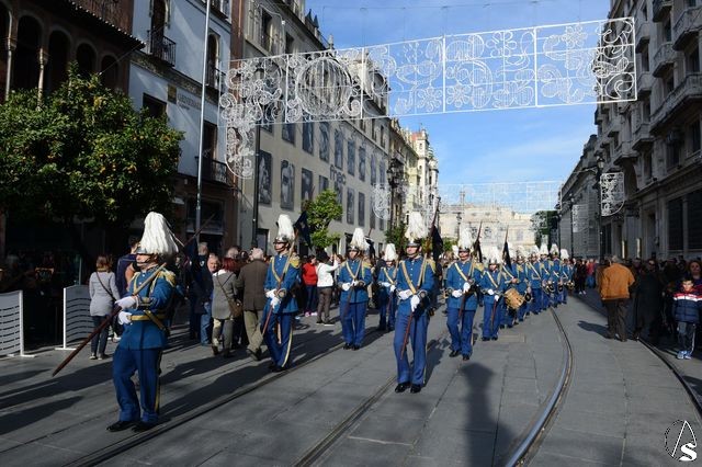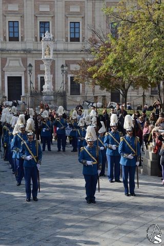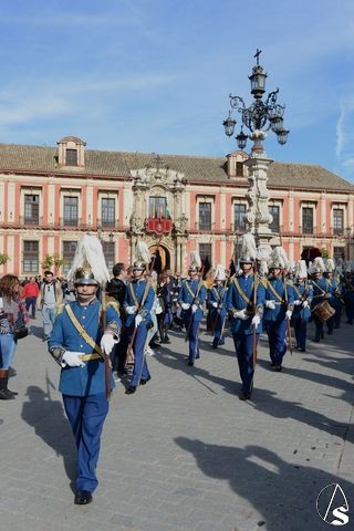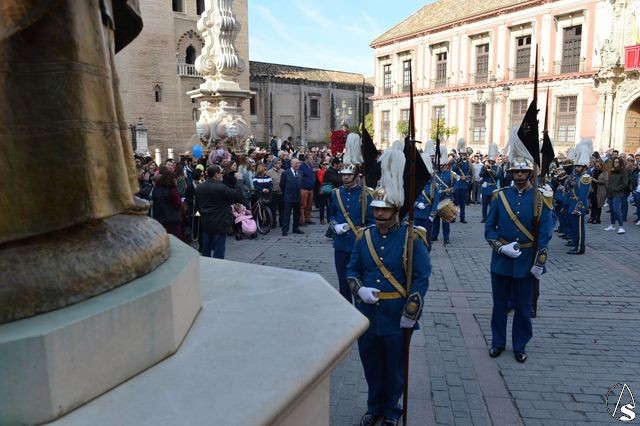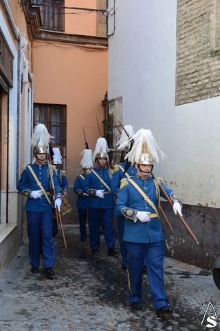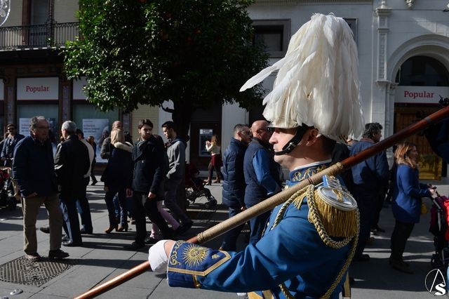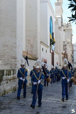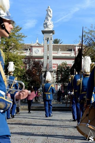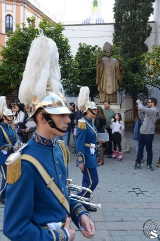 Arte Sacro. Tras la interpretación de los “Gozos de la Inmaculada” desde la cubierta del campanario de la Iglesia de San Antonio Abad, el cuerpo de clarines de la Banda del Sol partió hasta la Plaza de Santa Marta, donde interpretó los sones ante la estatua de San Juan Pablo II. Tras una breve parada en la plaza de Santa Marta, se dirigió hasta la estatua de María Inmaculada, que preside la Plaza del Triunfo, donde nuevamente interpretó los sones.