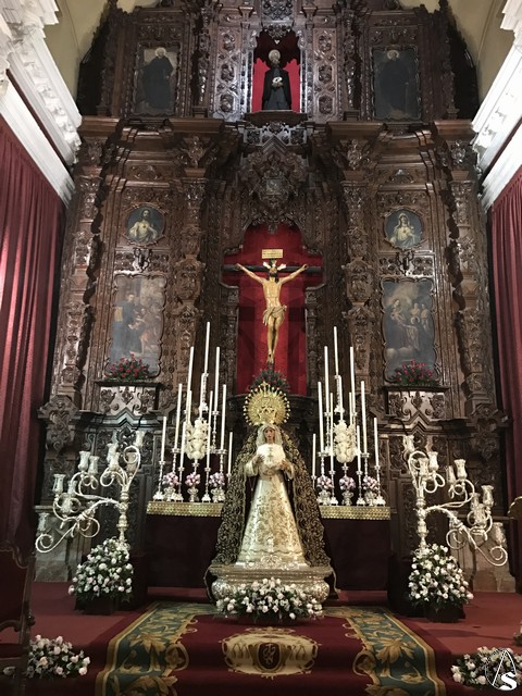 Como novedad de este año, Nuestra Señora de la Esperanza lucirá durante sus cultos un manto bordado en color rojo, perteneciente a la Virgen del Patrocinio de la trianera Hermandad del Cachorro.
