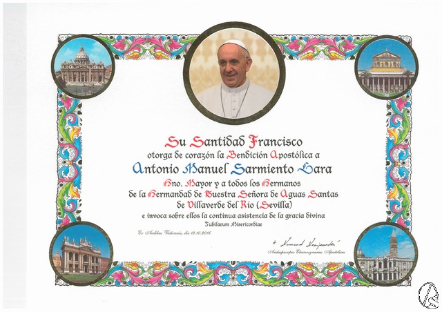 Fran Granado. La Hermandad de Nuestra Señora de Aguas Santas de Villaverde del Rio recientemente ha recibido recientemente y por petición del Hermano Mayor, la Bendición Apostólica por su Santidad el Papa Francisco.