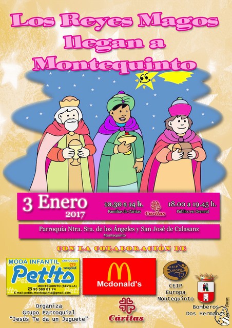 Fran Granado. Los Reyes Magos pasarán por la Parroquia de Montequinto el próximo 3 de Enero, en horario de mañana de 10:30 a 14:00 horas exclusivamente para las familias atendidas por Cáritas Parroquial y por la tarde abierto de 18:00 a 19:45 horas para todas las familias que os queráis acercar con los más pequeños de la casa. Acto que organiza el Grupo Parroquial en la campaña "Jesús te da un juguete"