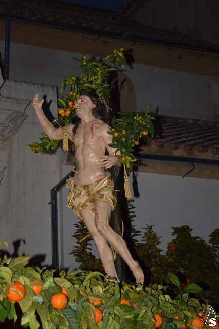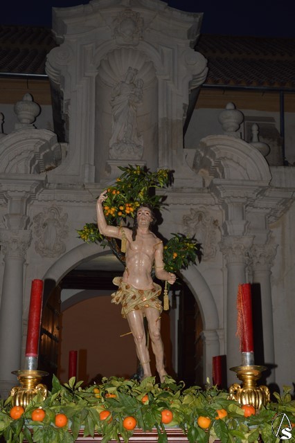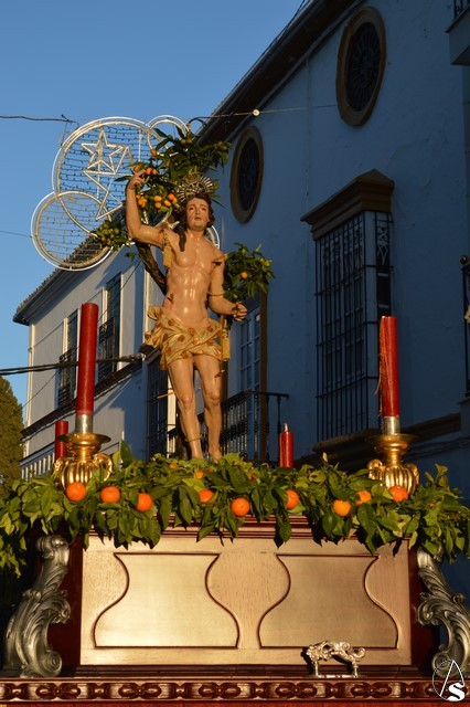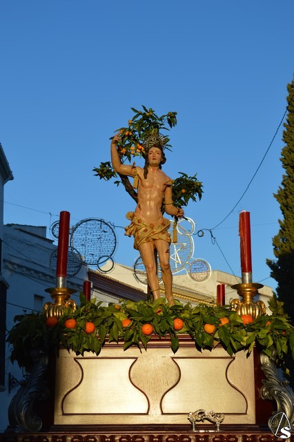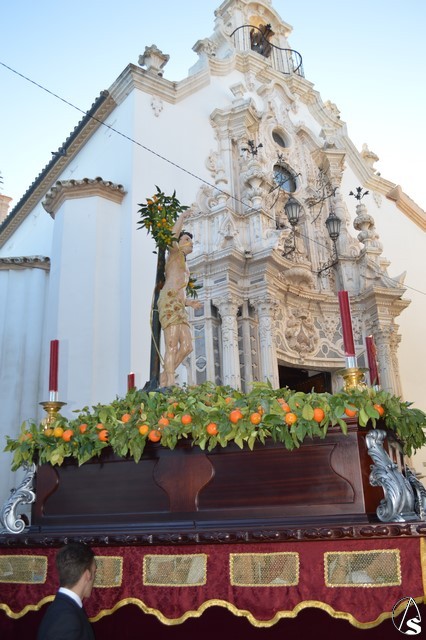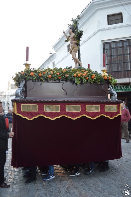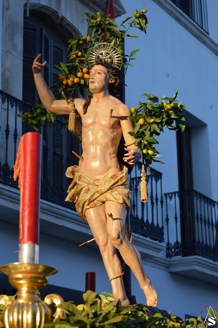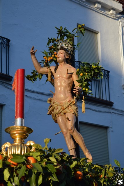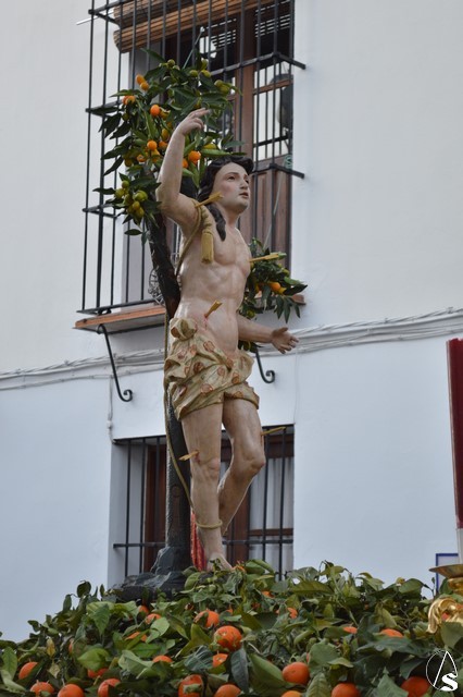 La imagen de San Sebastián, que podría fecharse en el siglo XVIII, fue portado en el paso de la Cruz de Mayo de la Hermandad de la Borriquita, estando exornado con naranjas y ramas de naranjos. El paso estaba alumbrado por cuatro hachones de cera roja en sus esquinas. Tras el mártir puso sus sones la Agrupación Musical del Dulce Nombre de Estepa.