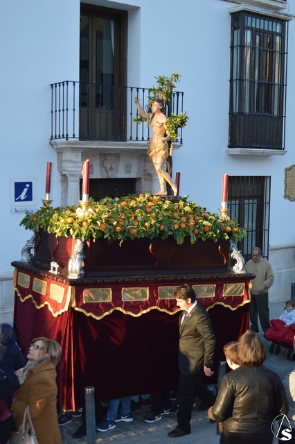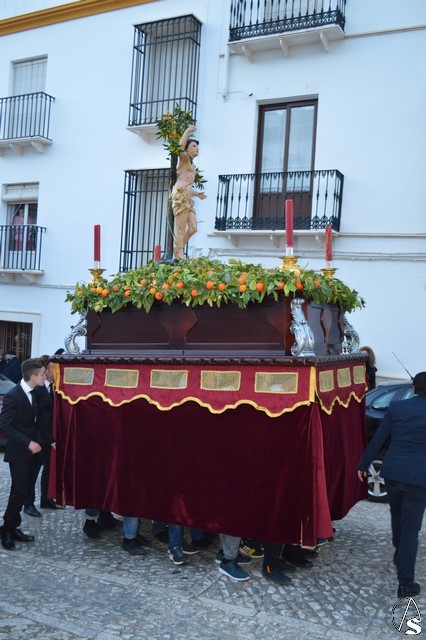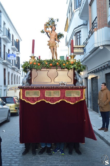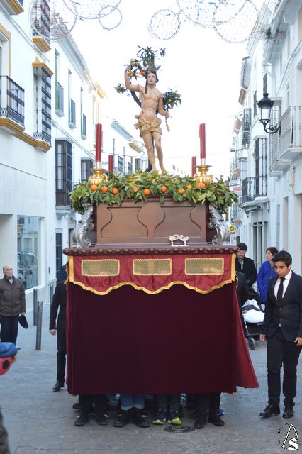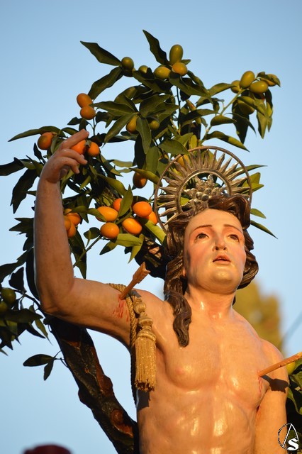 Gran esfuerzo el que realizan los jóvenes estepeños portando a San Sebastián por las empinadas calles de Estepa en una tarde en la cual el sol se reflejó en el rostro del mártir que se representa atado a un árbol mientras es saeteado.