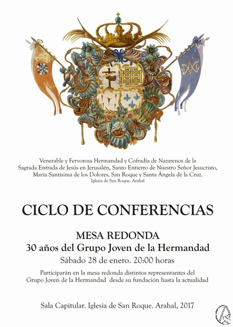 Fran Granado. La Venerable y Fervorosa Hermandad y Cofradías de Nazarenos de la Sagrada Entrada de Jesús en Jerusalén, Santo Entierro de Nuestro Señor Jesucristo, María Santísima de los Dolores, San Roque y Santa Ángela de la Cruz, organiza el Ciclo de Conferencias del presente año con la Mesa Redonda "30 años del Grupo Joven de la Hermandad".