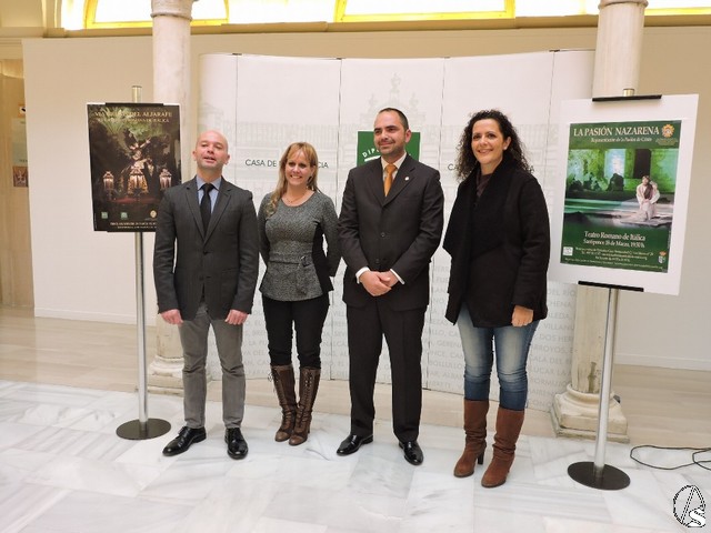 Arte Sacro. La diputada provincial de Cultura y Ciudadanía de la Diputación de Sevilla, Rocío Sutil, y el delegado de Cultura, Turismo y Deporte de la Junta de Andalucía, José Manuel Girela, acompañaron a la alcaldesa de la localidad sevillana de Santiponce, Carolina Casanova, y al hermano mayor de la Hermandad de Nuestro Padre Jesús Nazareno, Javier Velázquez, en la presentación del XXVII Vía Crucis de las Hermandades de Penitencia del Aljarafe, que se celebra hoy sábado 4, en el Conjunto Arqueológico de Itálica.