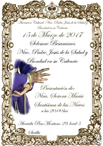 Arte Sacro. La Asociacion Cultural y cofrade Salud y Bondad informa del besamanos de Nuestro Padre Jesus de la Salud y Bondad en su Calvario el miércoles 15 de marzo, a las 20 horas y la presentacion de Nuestra Señora Maria Santisima de las Nieves a su barrio, obra del insigne imaginero Juan Ventura, en la Avda. Pino Montano nº 29-Local 5.