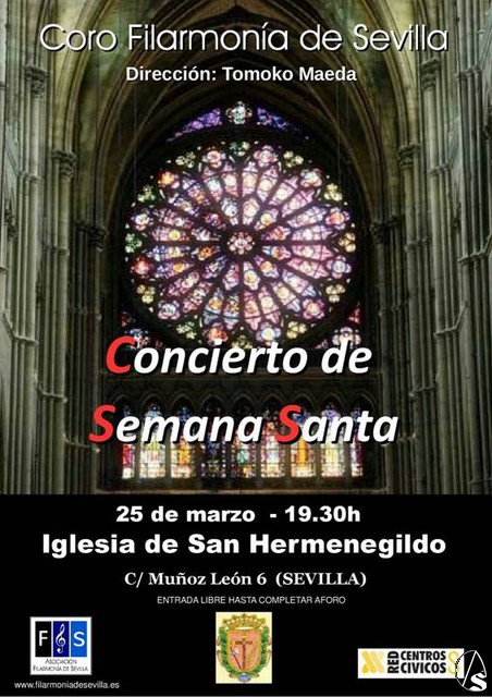 Arte Sacro. El día 25 de marzo, a las 20 horas, tendrá lugar en el templo de San Hermenegildo, un concierto de música sacra por parte del Coro Filarmonía de Sevilla dirigido por Tomoko Maeda. Actualmente, Tomoko se encarga además de la Dirección del Coro Ars Nova de la Escuela Municipal de Música y Danza de Espartinas (Sevilla). El repertorio será el siguiente: