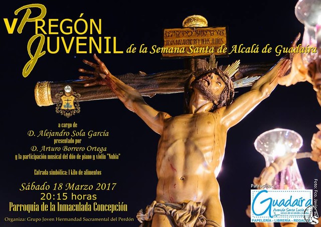 El sábado, 18 de marzo, una vez finalizada la misa, en torno a las 20:30 horas, se celebrará la quinta edición del Pregón Juvenil de la Semana Santa de Alcalá de Guadaíra, organizado anualmente por el Grupo Joven de la Hermandad del Perdón. En esta ocasión será el joven cofrade Alejandro Sola García el encargado de pregonar la Semana Santa alcalareña, siendo presentado por Arturo Borrero Ortega. El acto tendrá lugar en la Parroquia de la Inmaculada Concepción, sede de la cofradía del Martes Santo, y será amenizado por los sones del dúo de piano y violín "Nubia".
