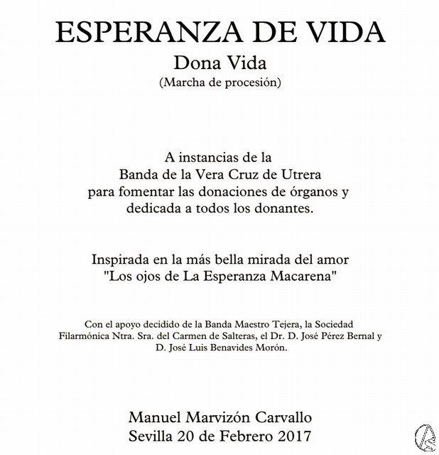 El autor, en su portada, escribe que esta marcha está dedicada a todos los Donantes de Órganos y que está inspirada en “la mas bella mirada del amor: los ojos de la Esperanza Macarena”.