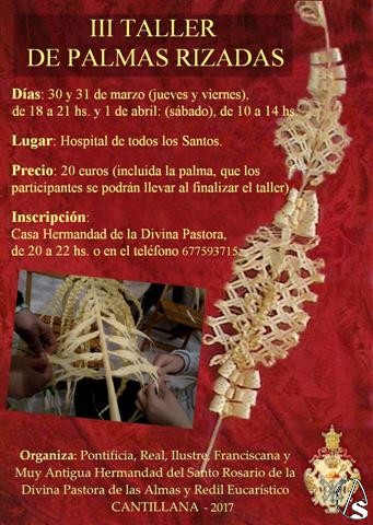 Arte Sacro. Por tercer año, la Hermandad de la Divina Pastora de Cantillana ha organizado un taller de elaboración de palmas rizadas. El curso, impartido por monitores de la hermandad, tendrá lugar en el Hospital de todos los Santos durante los días 30 y 31 de marzo, (jueves y viernes) de 18 a 21 horas, y 1 de abril (sábado) de 10 a 14 horas.