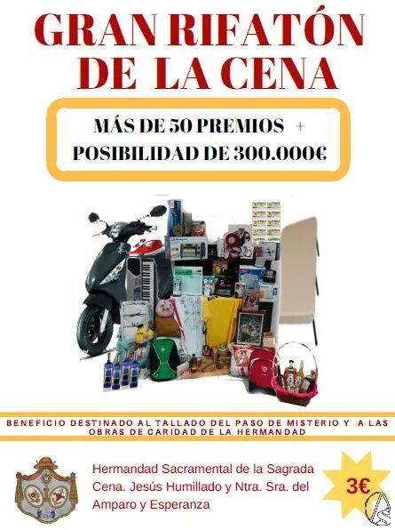 Arte Sacro. La Hermandad de la Cena de Dos Hermanas pone en marcha un gran proyecto para sufragar los gastos del tallado del paso del Señor de la Cena. Además, adquiriendo una papeleta, colaboras con las obras de caridad de la Hermandad. La lista de premios, formada por más de 50 objetos es la siguiente:
