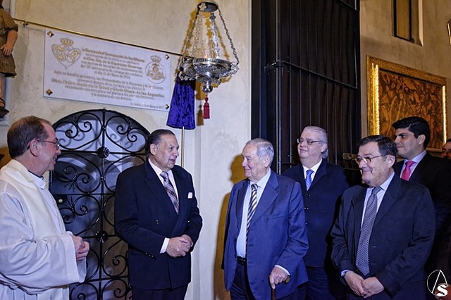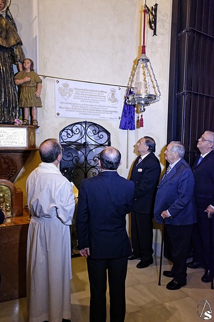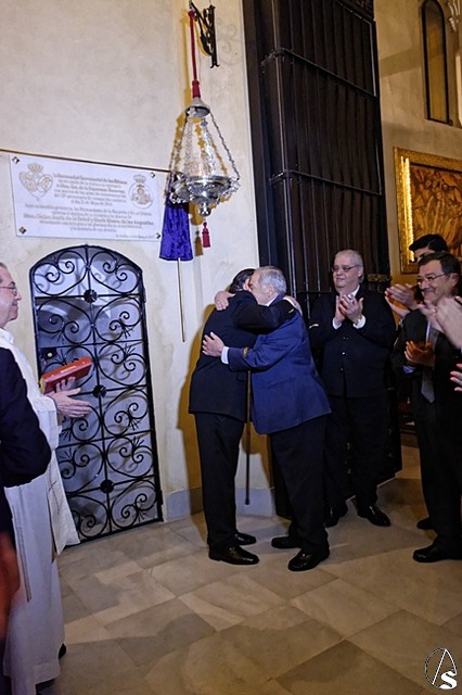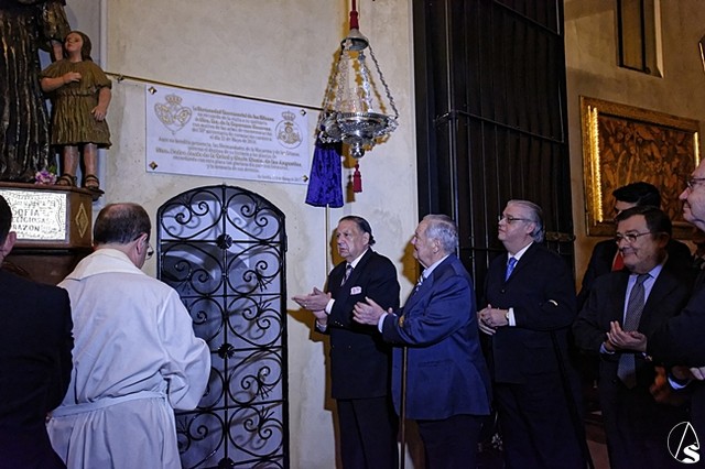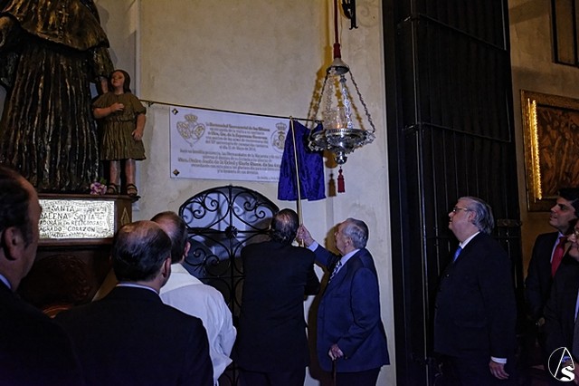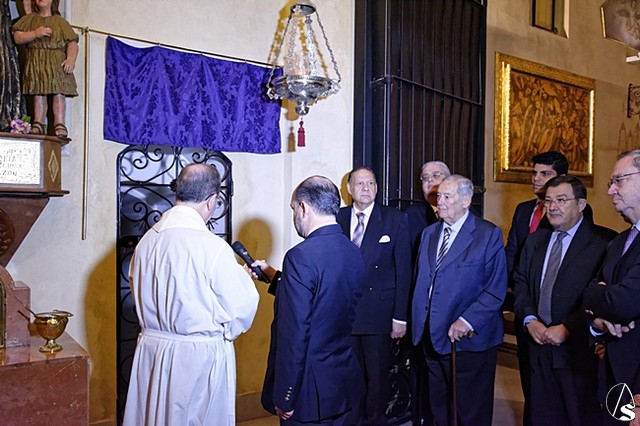 Posteriormente se descubrió una placa situada entre la capilla sacramental y el acceso al besapié del Stmo Cristo de la Salud.