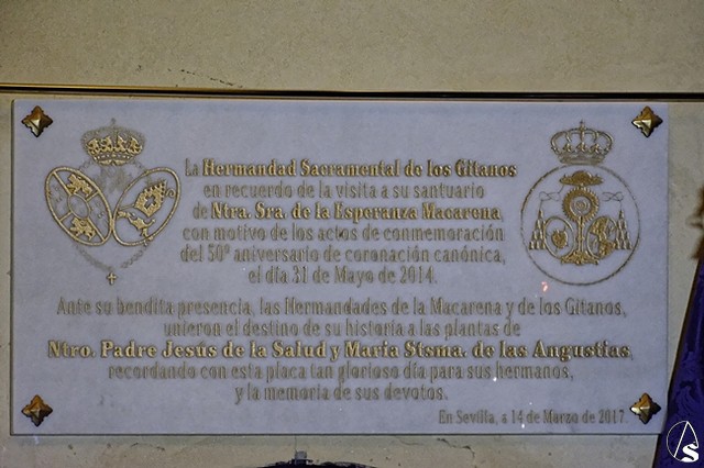 Fco Javier Montiel. La Hdad Sacramental de Los Gitanos ha conmemorado la visita de Ntra Sra. de la Esperanza Macarena a su Santuario, el pasado 31 de mayo de 2014, con motivo de los actos del 50º aniversario de su coronación canónica, con la colocación de una placa en recuerdo de tal efemérides y la organización de un concierto de la Banda de Cornetas y Tambores de la Centuria Macarena en honor de la Hdad. de la Macarena que interpretó el siguiente repertorio: Macarena (Bienvenido Puelles), Réquiem (Bienvenido Puelles), Señor de Sevilla (J. Martín), Toma tu Cruz (F.J. Navarro), Virgen de la Salud (Bienvenido Puelles), Una vida tras de ti (F. Moraza) y Una Rosa en el cielo (F. Moraza).