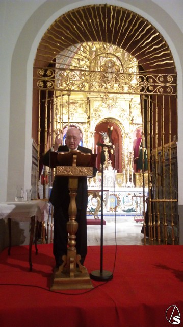 Terminó su presentación D. Ángel Gutiérrez anticipando un día de gloria, dejando al pregonero “en manos de esta Niña bonita de Santiago –María Stma. Del Socorro- a la que usted vio nacer”, con la certeza de que en el cielo “más allá de estas bóvedas D. Vicente Romero Escacena y muchos más esperan su palabra culta y consagrada siempre a servir más cada día a Jesús Nazareno de Alcalá”.