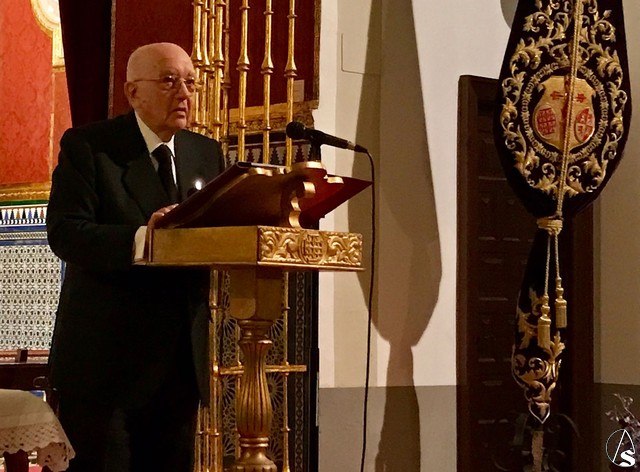 El primero de ellos, su singladura en la Hermandad, desde su ingreso en el año 1934 hasta nuestros días, convirtiéndose así “en una suerte de don Juan de Borbón de nuestra Hermandad, hijo de Hermano Mayor y padre de Hermano Mayor”, recordando que por sus ojos ha transcurrido la vida de la Hermandad en los últimos ochenta años. D. Vicente vio la Hermandad reducida a cenizas, y también la vio resurgir cual ave Fénix de la mano de su padre, D. Vicente Romero Escacena, hasta convertirla en “Madre y Maestra”; así como su pertenencia a la Junta de Gobierno durante diecisiete años desempeñando diversos cargos; sin olvidar sus brillantes intervenciones tanto en el cincuentenario como en el septuagésimo quinto aniversario de la bendición de la venerada imagen de Nuestro Padre Jesús Nazareno.