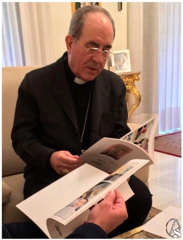 El Arzobispo Asenjo, con Viñetas Cofrades y el álbum de la Semana Santa de Sevilla