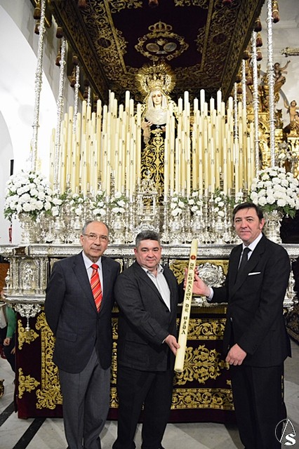 El cirio ha sido pintado este año, por el pintor nacido en el barrio del Cerro del Águila, Agustín Primo Muñoz, que estuvo acompañado por su esposa Elena Sánchez Izquierdo, hermana de esta Corporación del Sábado Santo.