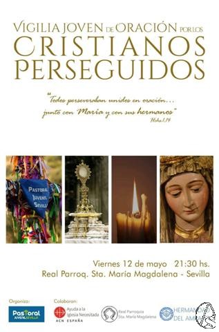 Arte Sacro. El viernes 12 de mayo a las 21,30 horas se celebrará en la parroquia de la Magdalena, Vigilia de oración por los cristianos perseguidos organizada por la Delegación de Pastoral Juvenil de la Archidiócesis de Sevilla en colaboración con la Fundación de la Santa Sede Ayuda a la Iglesia Necesitada, la Parroquia de Santa María Magdalena y la Hermandad de Ntra. Sra. del Amparo.