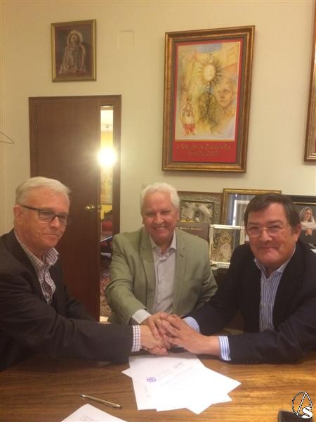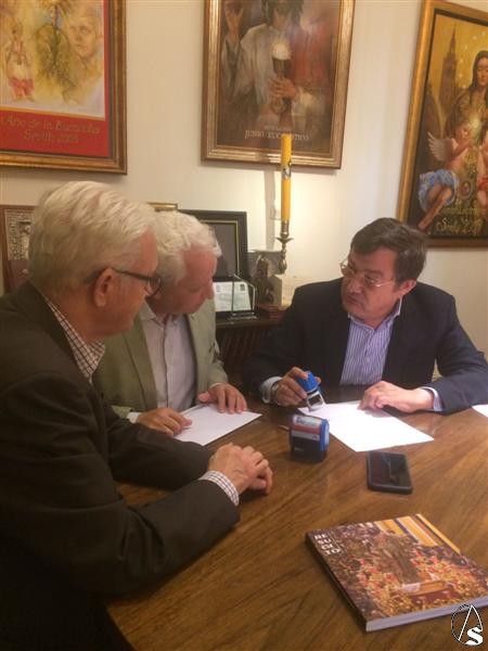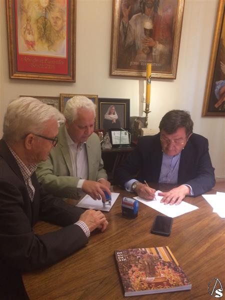 En el acto de la firma del convenio participaron el presidente del Consejo Joaquín Sainz de la Maza, el vicepresidente de la institución cofradiera Antonio Piñero y el presidente de la Fundación Tutelar TAU Fray Rafael Pozo.