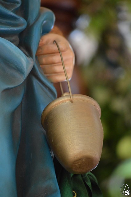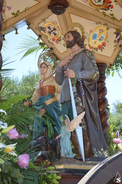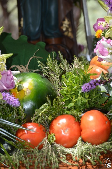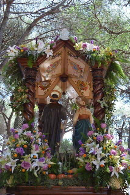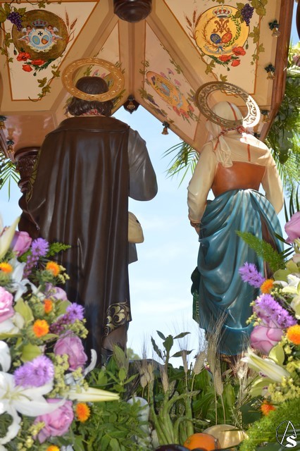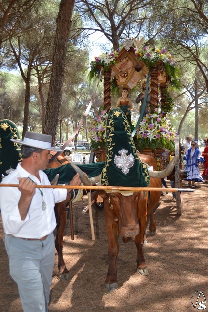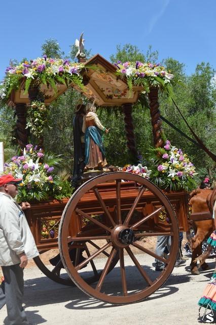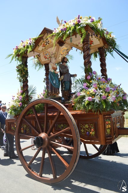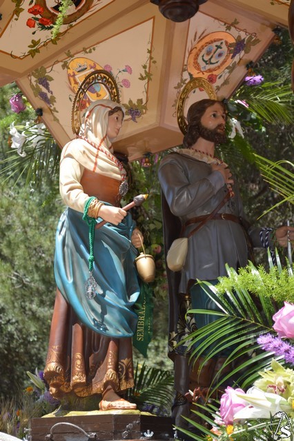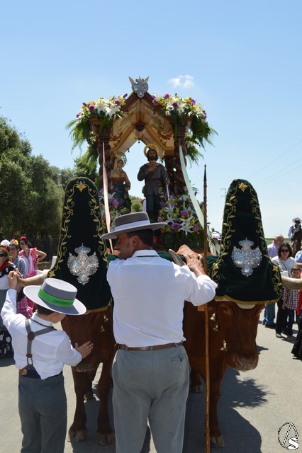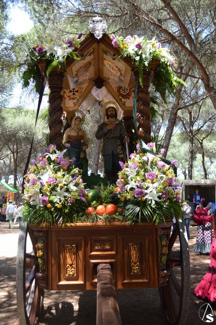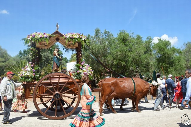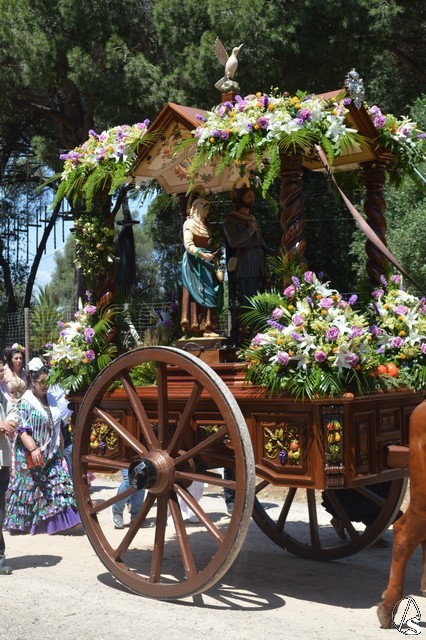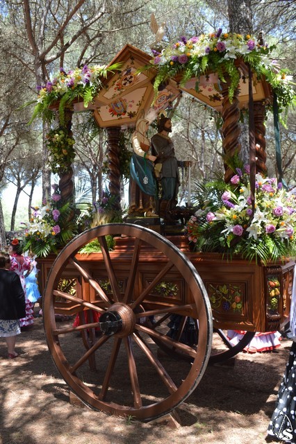 Las imágenes de San Isidro Labrador y Santa María de la Cabeza peregrinan en una bella carreta de madera tallada donde aparece en su techo los escudos de las distintas hermandades de Los Palacios. Exornan la bella carreta con una variedad de flores y con productos típicos de la agricultura de Los Palacios y Villafranca.