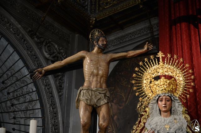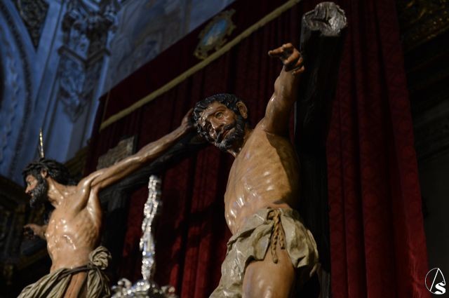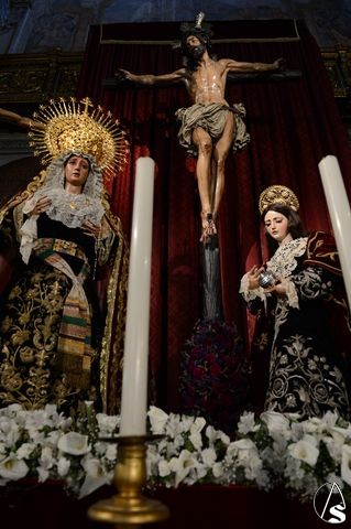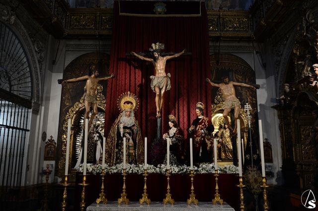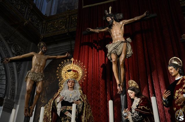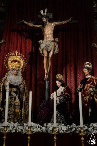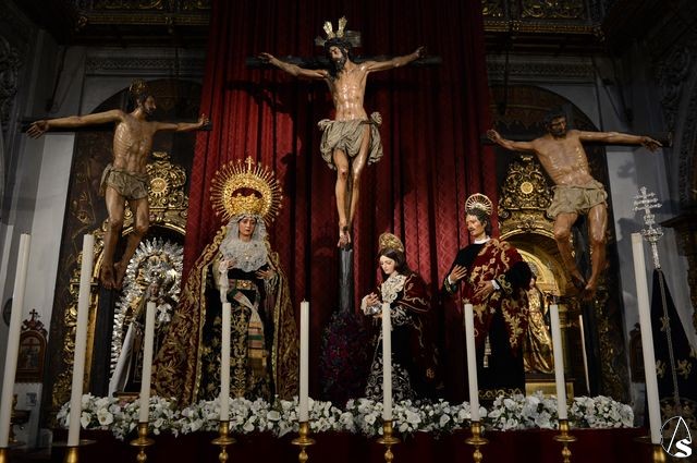 Arte Sacro. En el bello altar que la Hermandad de Montserrat ha dispuesto en la Real Parroquia de Santa María Magdalena, en la que figuran el Cristo en la Conversión, la Virgen de Montserrat, Santa María Magdalena, San Dimas, Gestas y San Juan Evangelista, este último luce estrenando su reciente restauración, que ha sido realizada por Rocío Sáez Millán, Licenciada en Bellas Artes por la Universidad de Sevilla, con la especialidad en restauración y conservación de bienes culturales.