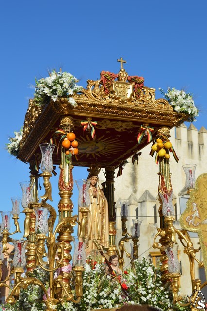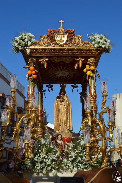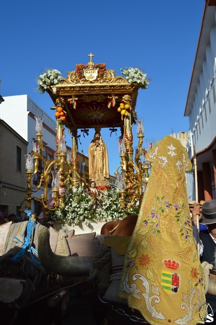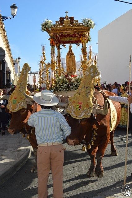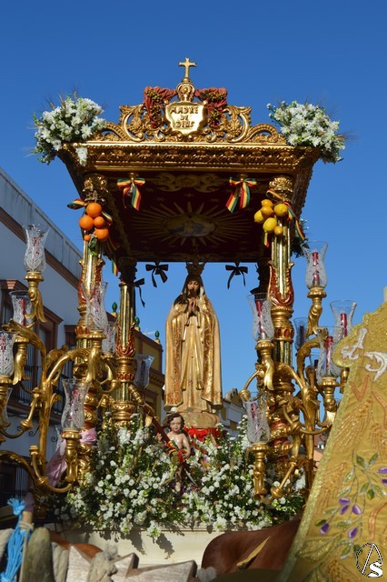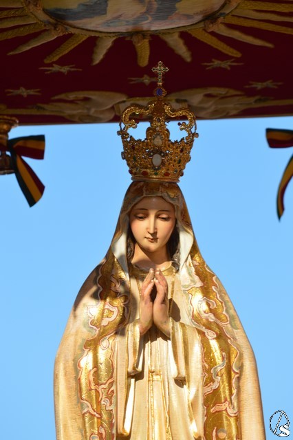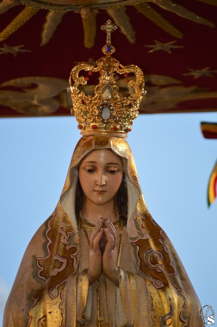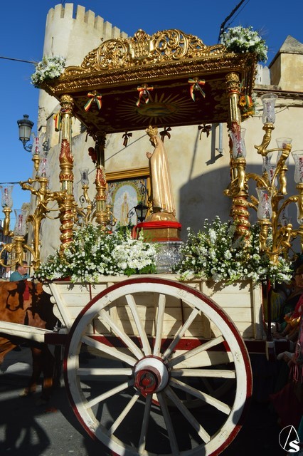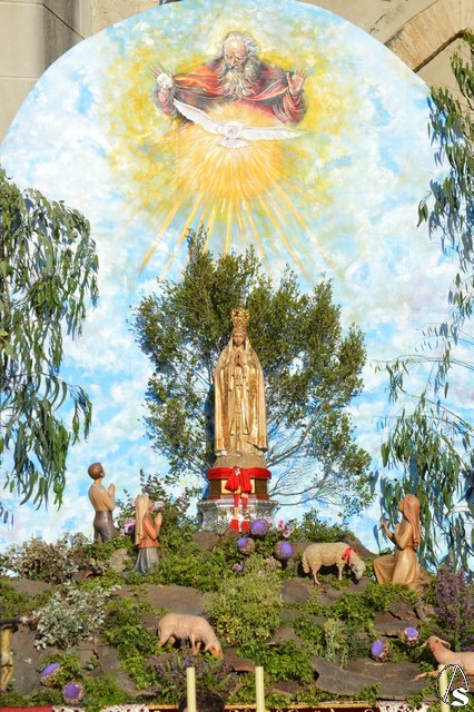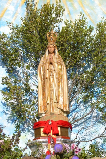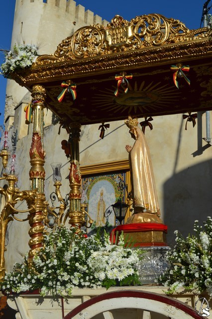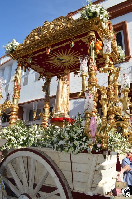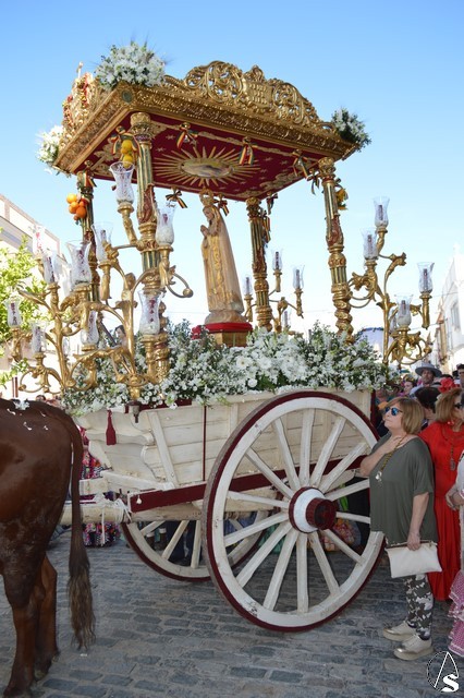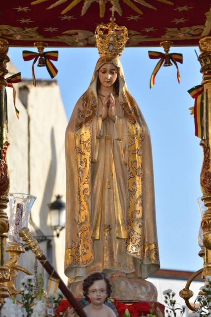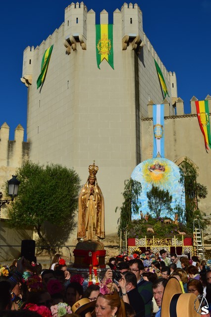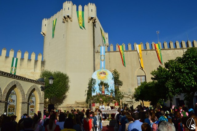 Este año la Misa de Romeros se ha celebrado a los pies del castillo de Los Molares, en un hermoso altar montado por todos sus hermanos y devotos. A los pies de la Santísima Virgen se encontraban los pastorcitos: Francisco, Jacinta y Lucía, recreando una estampa que hace ahora cien años tenía lugar en Cova de Iría. Tras la Misa de Romeros la Santísima Virgen fue bajada de altar efímero para ser entronizada en su carreta despertando el fervor de todo un pueblo. Entre vivas y ovaciones la Santísima Virgen recorrió los pocos metros que separaban el altar de la carreta entre un inmenso gentío.