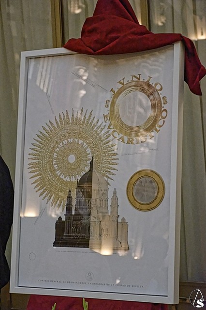 El cartel utiliza el color blanco como fondo uniforme por ser en la liturgia el reservado para el júbilo y el culto eucarístico. Un sagrario, proyectado mediante un procedimiento analógico tan afecto a la cultura arquitectónica, es el eje articulador y centro del cartel. Representa, recomponiendo fragmentos de los templos sevillanos donde radican las siete Hermandades Sacramentales no fusionadas, jalonadas por la iconografías de cuatro santos titulares de Hermandades fusionadas y presididos a su vez por la Inmaculada de San Lorenzo, una alegoría del Sacramento y un tributo a la orfebrería hispalense.