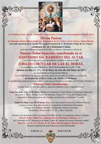 Arte Sacro. Desde su fundación, la hermandad de la Divina Pastora y Santa Marina se ha sentido especialmente responsable del fomento del culto al Santísimo Sacramento, real presencia de Nuestro Señor Jesucristo entre nosotros. Ya las primeras novenas se hacen ante Jesús Sacramentado y en 1748 la hermandad adopta la costumbre del Jubileo Circular de las Cuarenta Horas, en un turno que ahora rige la Real Congregación de Luz y Vela, cuidando del mayor esplendor de los actos de culto y adoración que ofrecen 123 instituciones y parroquias a lo largo del año, acogiendo por tres días la Exposición de Su Divina Majestad en la mayoría de templos de nuestra ciudad.