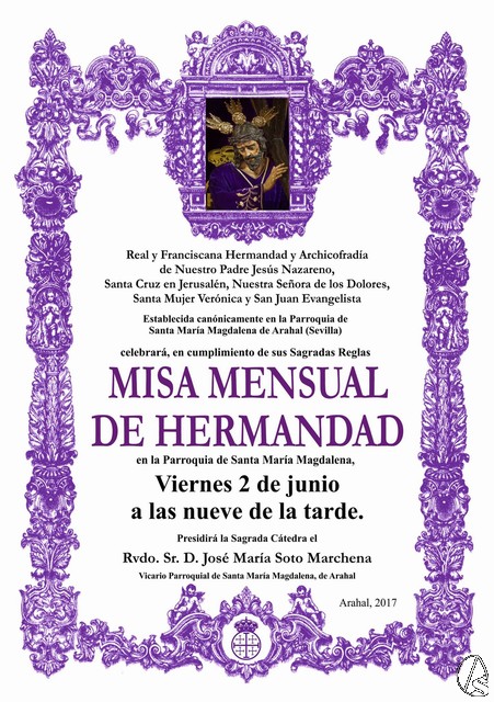 Arte Sacro. La Real y Franciscana Hermandad y Archicofradía de Nuestro Padre Jesús Nazareno, Santa Cruz en Jerusalén, Nuestra Señora de los Dolores, Santa Mujer Verónica y San Juan Evangelista, establecida canónicamente en la Parroquia Santa María Magdalena de Arahal. Celebra, en cumplimiento de sus Sagradas Reglas Misa Mensual de Hermandad en la Parroquia Santa María Magdalena hoy viernes día 2 de junio a las 21:00 horas.