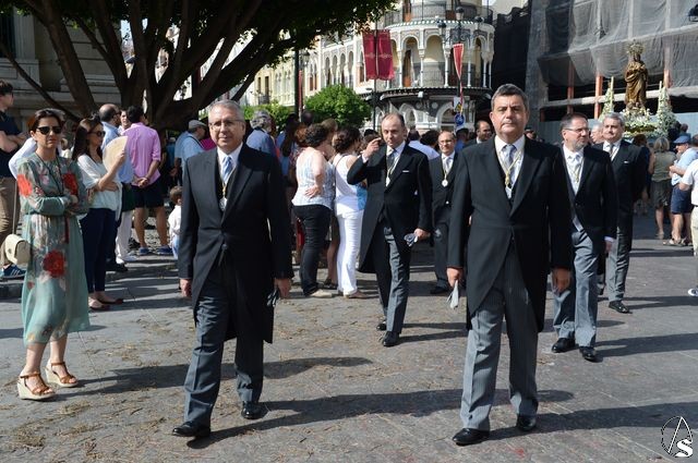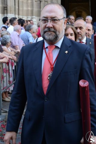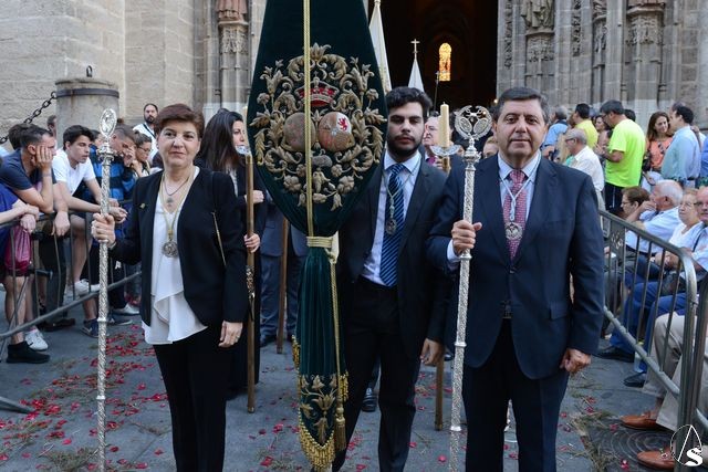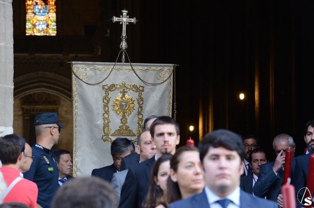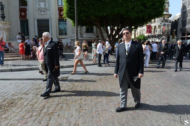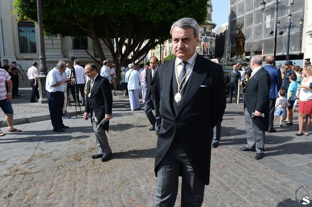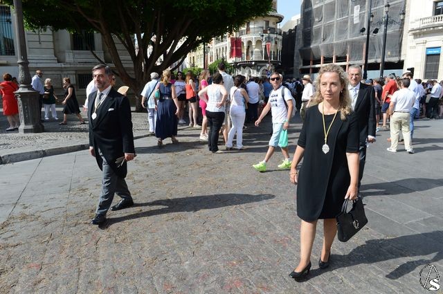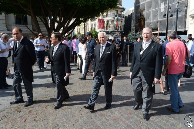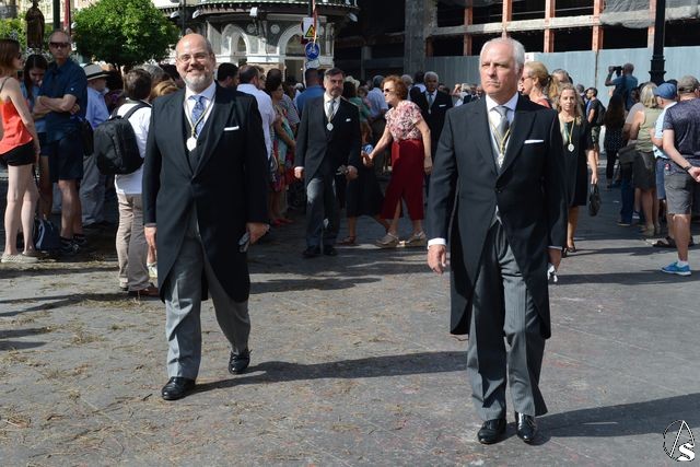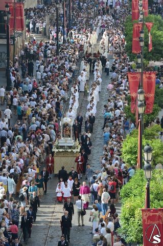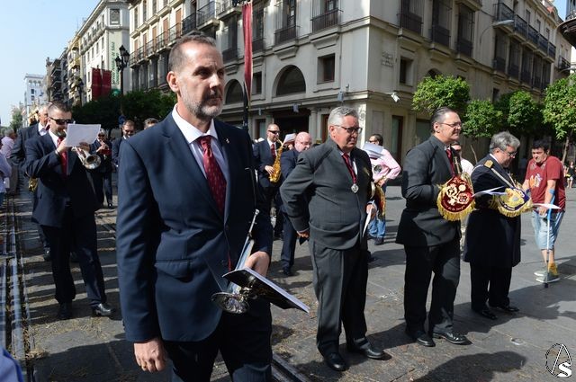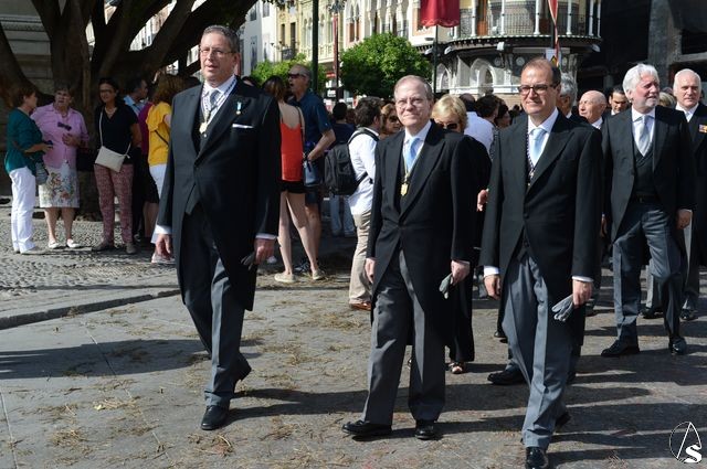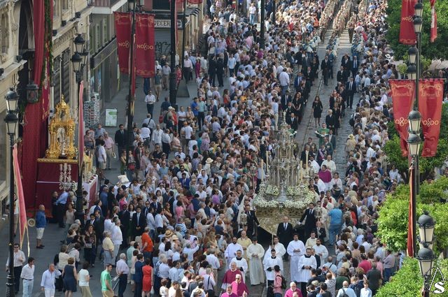 Abriendo el cortejo los niños carráncanos de la Sacramental del Sagrario con el Guión Sacramental. Tras ellos, las representaciones del as hermandades de glorias, penitencia y sacramentales por orden de antigüedad. También representaciones de las distintas Cámaras, jefatura de Policía, Colegios Oficiales, Ateneo, Reales Academias, Universidad, Cuerpo Consular, Audiencias, Órdenes, Consejo de Cofradías, Delegaciones Diocesanas, Cáritas, Seminario, Ordenes Terceras, Diáconos, Comunidades Religiosas, Tribunal Eclesiástico, Clero Secular, Curia Diocesana, Universidad de Curas, Maestranza de Caballería, Niños Seises, Cabildo Catedral y Coral.
