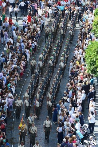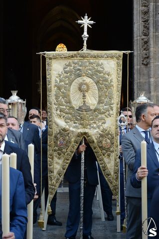 Sobre las 12,15 horas, entraba el paso de la Custodia en la Catedral, por la puerta de Palos, tras el desfile militar por delante del mismo.