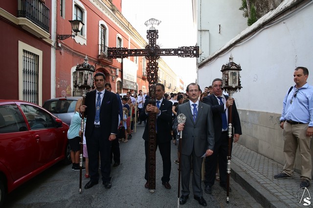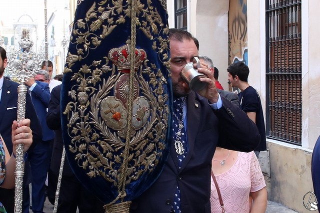 El cortejo procesional comenzó a salir presidido de la cruz de guía de la cofradía y acompañado de un nutrido números de hermanos con cirios, las altas temperaturas marcaron el discurrir de la procesión donde los aguadores de la hermandad tuvieron trabajo extra teniendo que atender a los hermanos que formaban el cortejo.